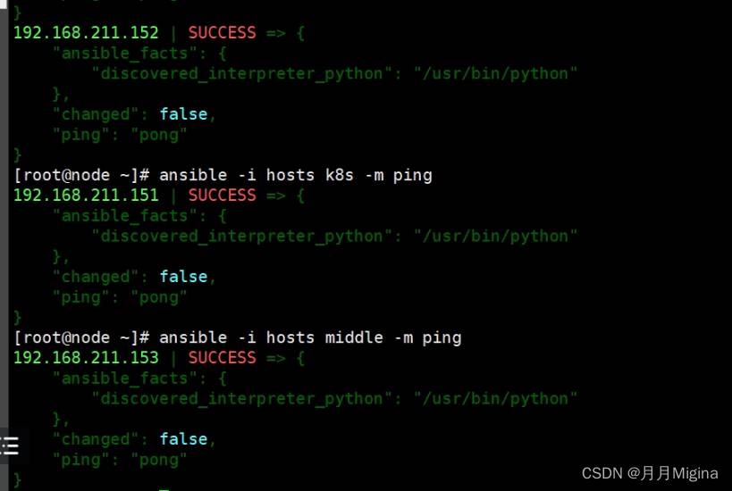 ansible -i hosts all -m ping   ## ansible -i 指定主机清单