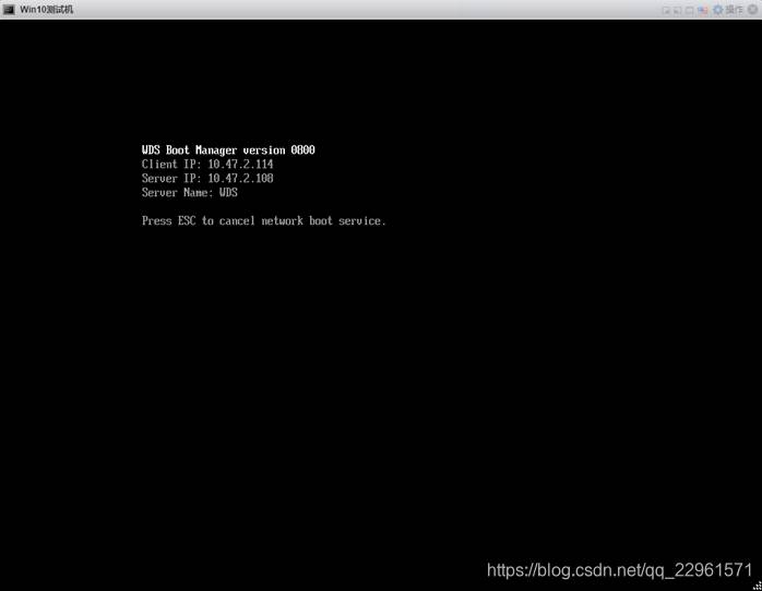 开机后PXE启动,已经识别到我WDS服务器了,下面是客户端和服务器的地址还有服务器的名称。这个时候按ESC可以取消安装。