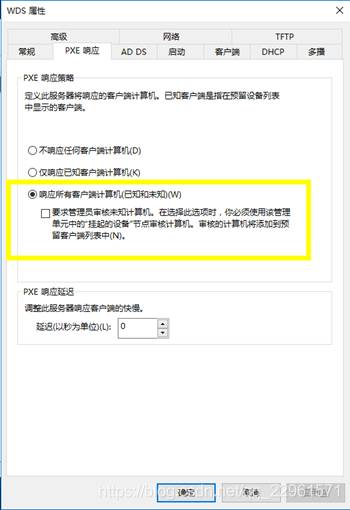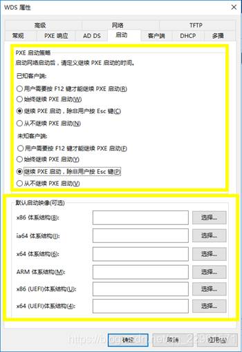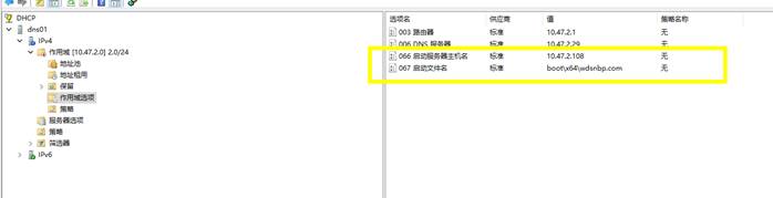 此处需要注意66 67选项,测试时配置文件配置boot\x64\pexboot.com时无法跨网段安装,后期更改为boot\x64\wdsnbp.com后可以。启动服务器主机名为WDS名称(172.16.2.108)