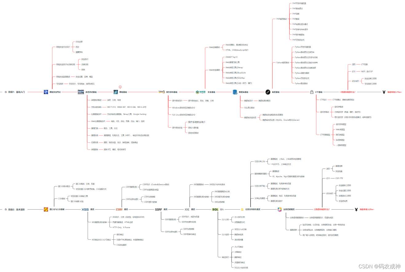 下面给大家总结了一套适用于网安零基础的学习路线,应届生和转行人员都适用,学完保底6k!就算你底子差,如果能趁着网安良好的发展势头不断学习,日后跳槽大厂、拿到百万年薪也不是不可能!