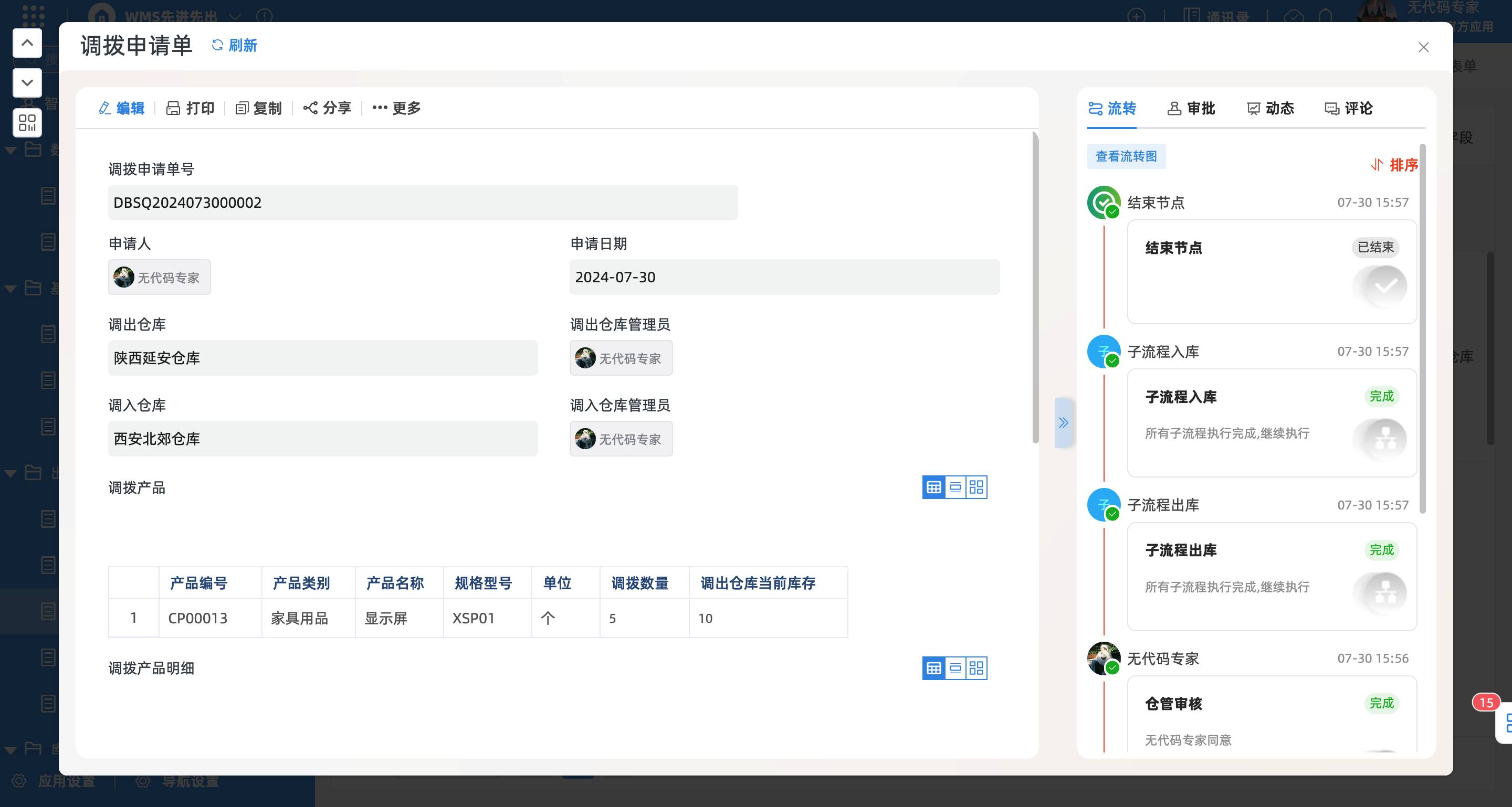 - 调拨申请单:简化仓库调拨申请流程,快速发起调拨申请,系统自动提醒库管审批。