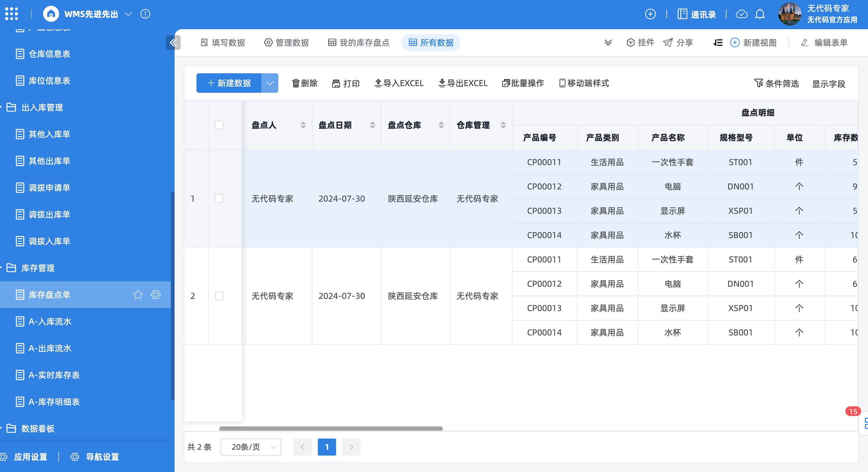 - 我的库存盘点:同一张我的库存盘点表,当前用户只能查看和管理自己的库存盘点。