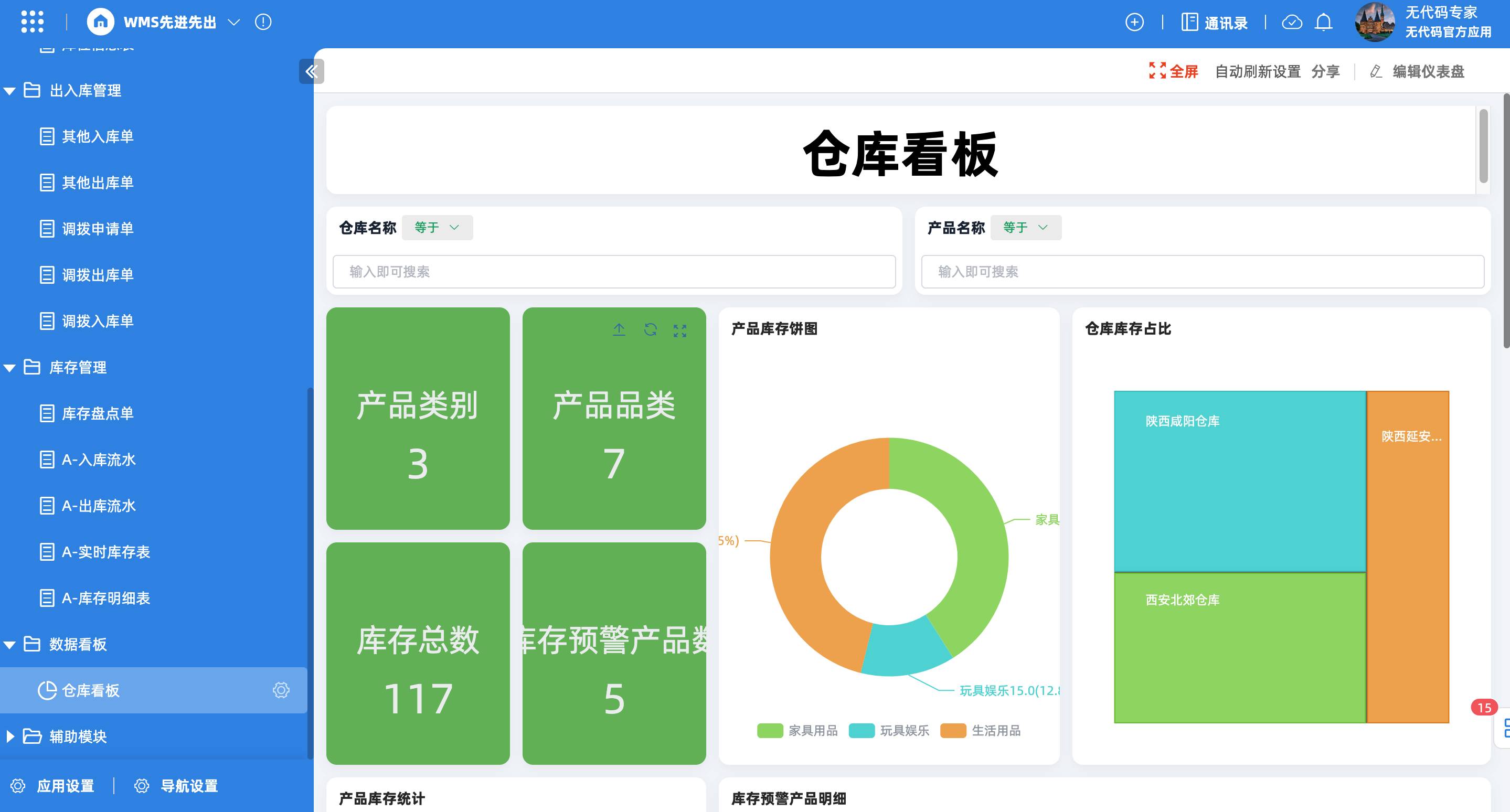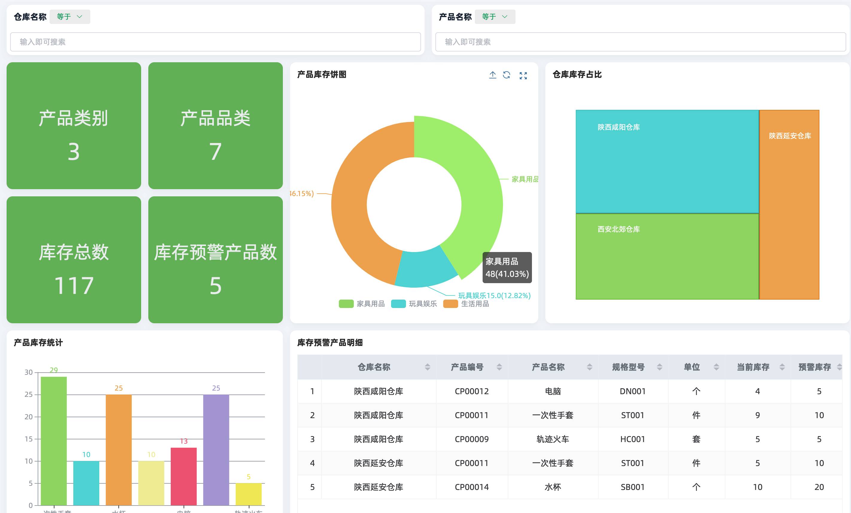 - 仓库看板:监控出入库流程更新材料、产品总库存,并统计各产品占比,智能监控库存预警。