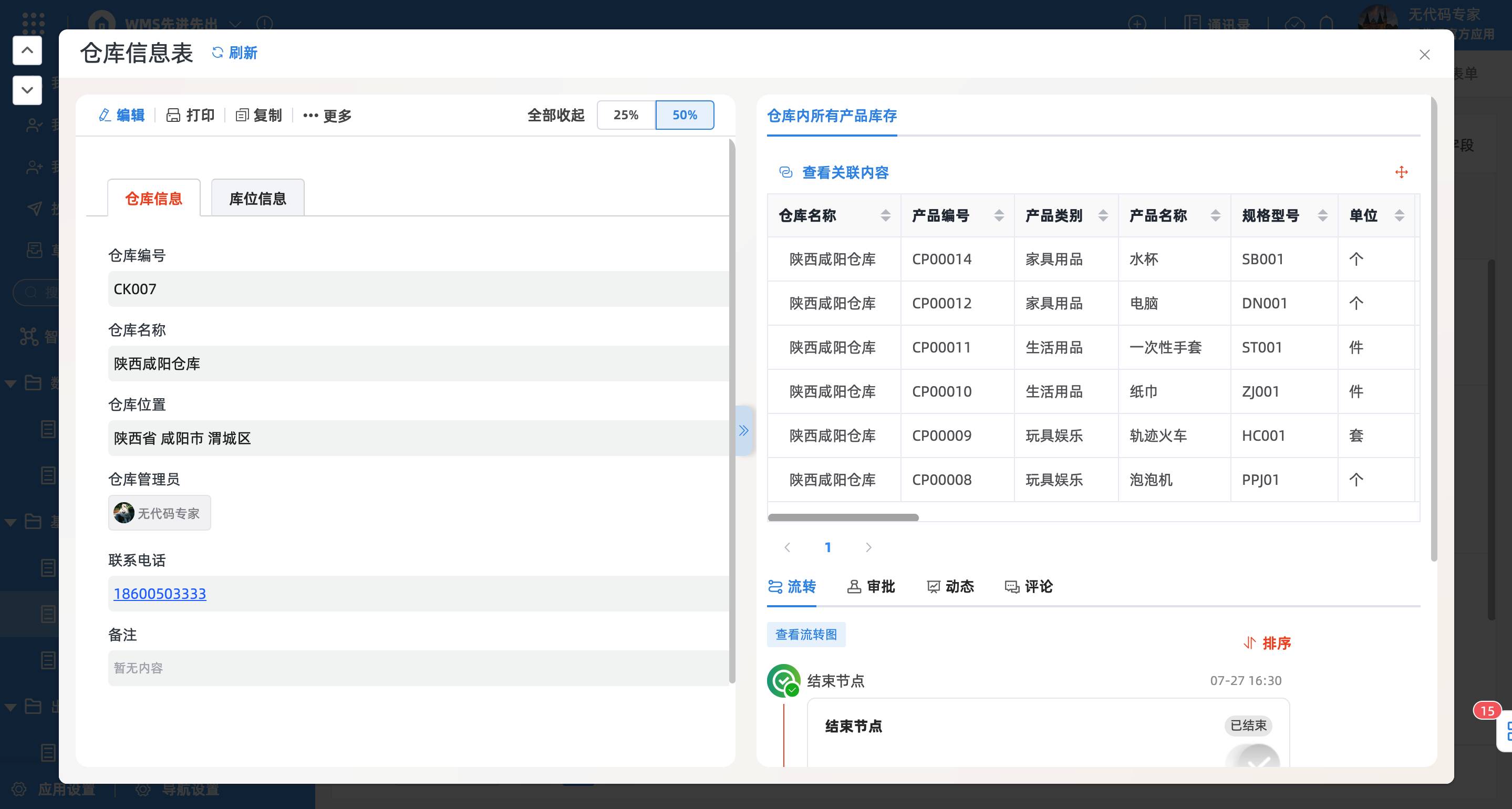 - 信息更新:人为手动更新或删除仓库信息表,系统自动同步更新或删除库位信息表。