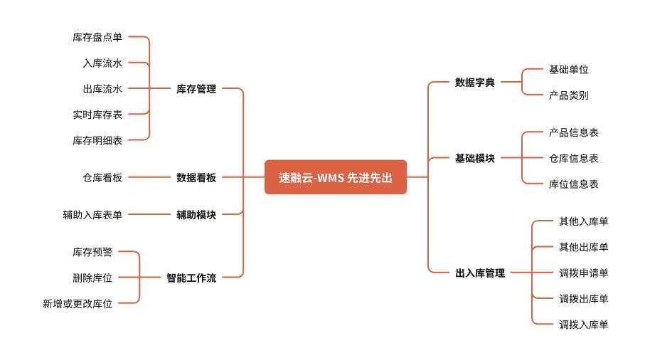 WMS 系统核心功能包括:基础模块、BOM 管理、出入库管理、库存管理、数据看板、辅助模块、智能工作流管理等。
