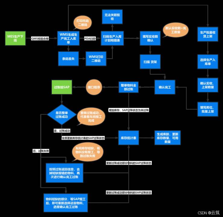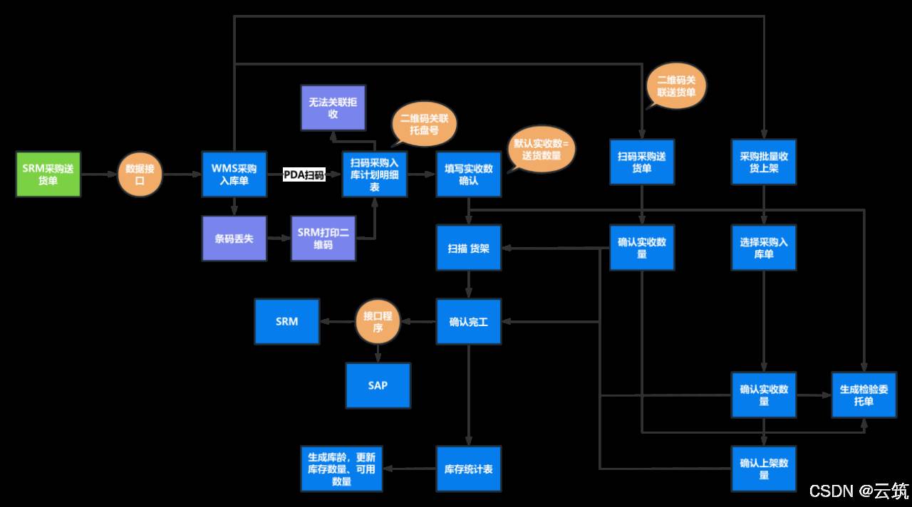 入库作业模块主要分为采购入库、生产完工入库、退料入库、销售退货入库、外协退料入库等,其中采购入库又分为原材料采购、在制品采购、成品采购、非生产性采购等,不同的物料类型采购略有不同。(下面入库流程设计以原材料为示例)