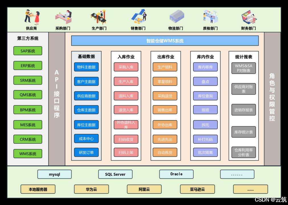 在智能制造仓储管理解决方案的架构设计中,技术平台部分采用已经非常成熟的低代码开发平台,并结合SQL数据库以及API网关接口来实现数据的存储以及与第三方系统的对接,这种设计方案能够显著提升系统的灵活性、可扩展性和集成能力。