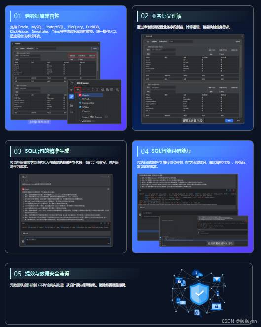 用户直接用自然语言描述数据库查询需求,自动转换成可执行的SQL语句。仅使用元数据进行查询,不传输实际数据,保证数据安全。