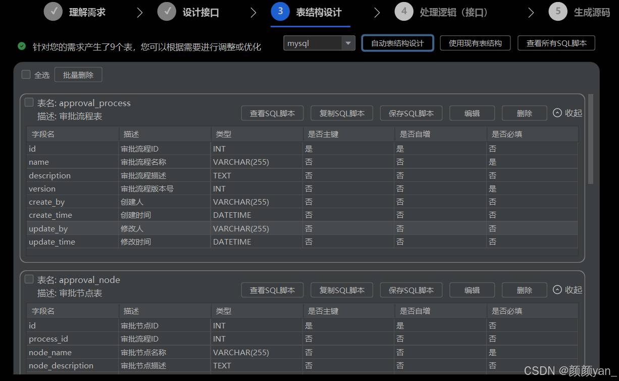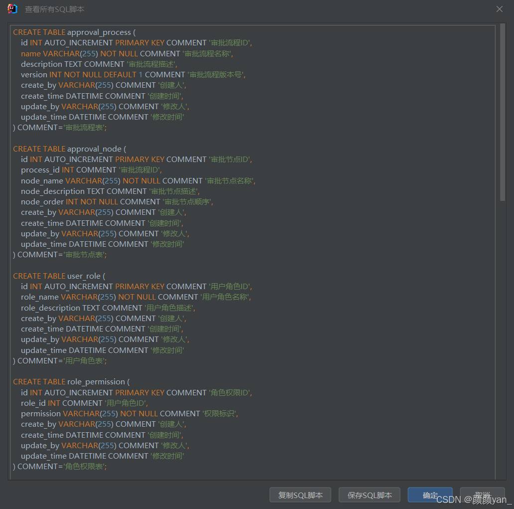 点击查看所有SQL脚本可以看到生成的完整数据库初始化脚本,所有SQL语句都可以直接在MySQL数据库中执行。