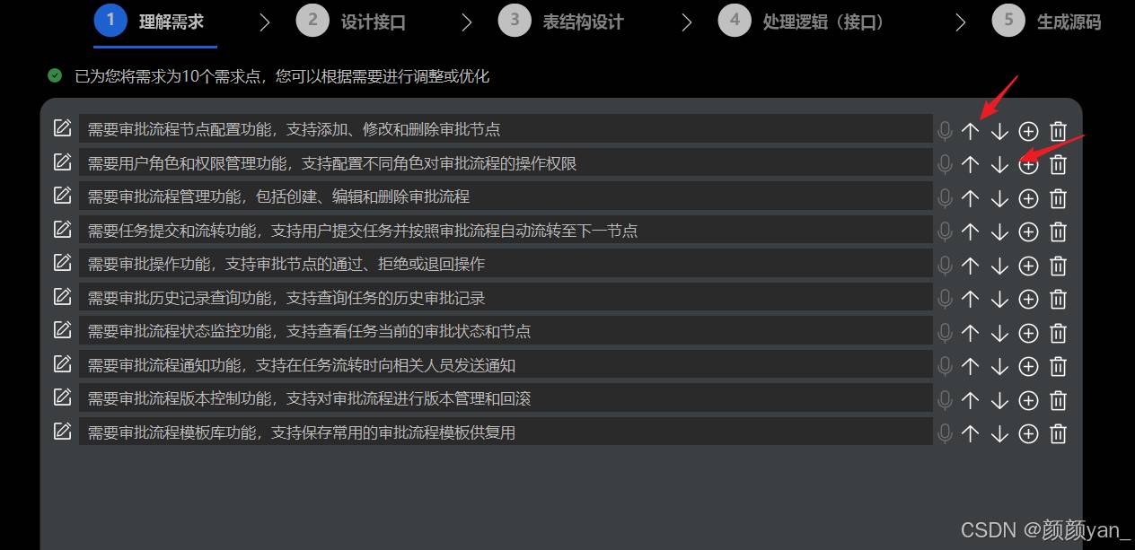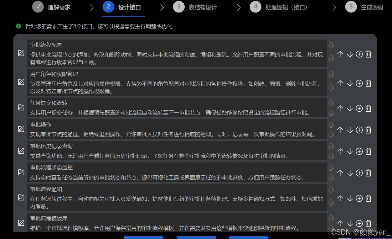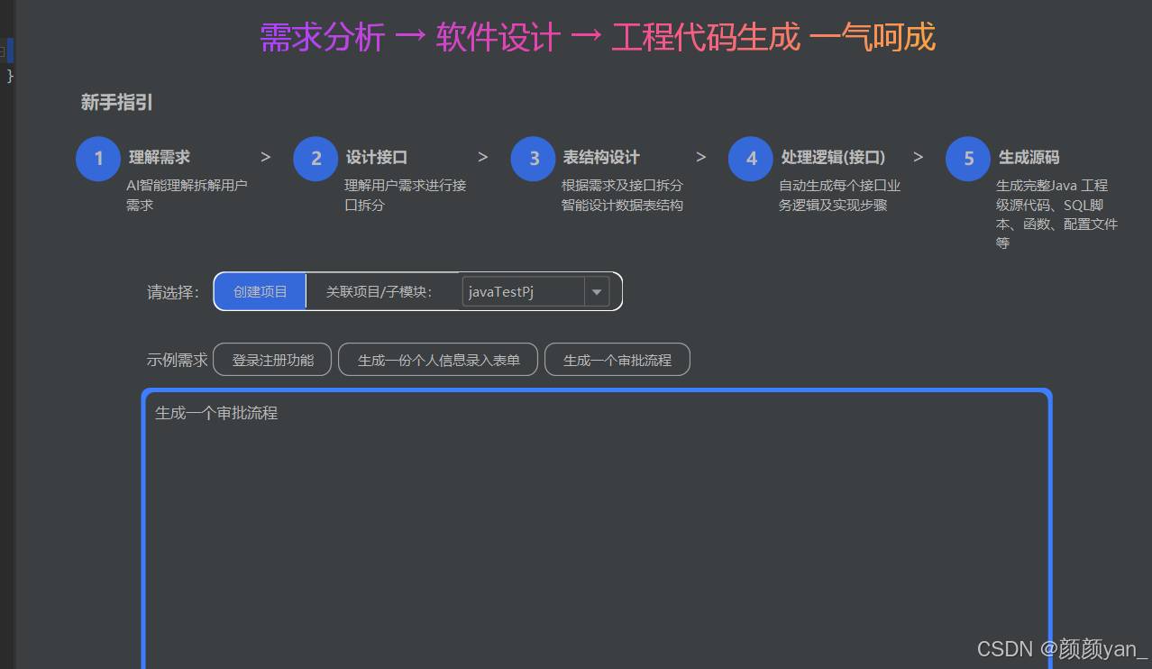 飞算JavaAI提供了清晰的开发流程指引,支持从零开始创建项目或基于现有项目扩展,当输入开发一个审批流程系统的需求后,飞算JavaAI自动生成了具体的需求点,包括审批流程配置管理、用户角色和权限管理、任务提交和流转、审批操作处理、数据统计分析和系统配置管理等核心功能。