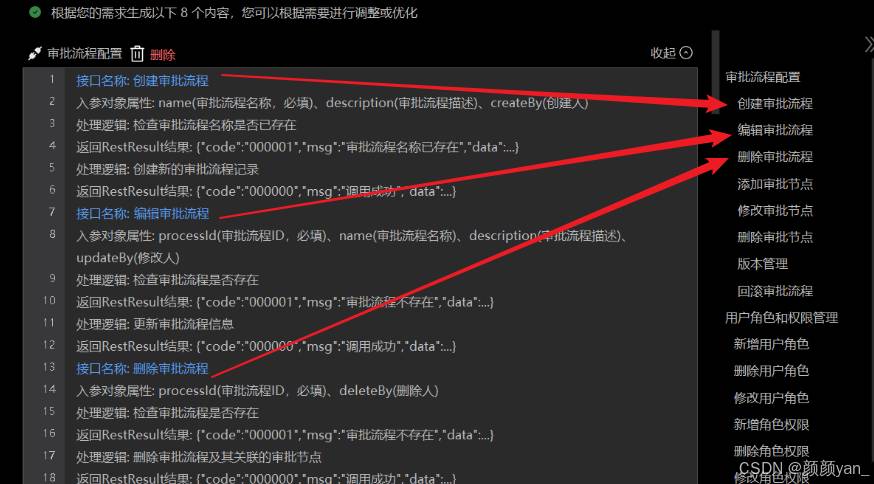 基于需求分析结果,飞算JavaAI自动设计了相应的API接口,包括审批流程配置接口负责流程模板创建和管理、审批节点配置、流程版本控制,用户角色权限接口处理用户管理CRUD操作等接口。接口遵循RESTful设计规范,具有完整的HTTP状态码定义、标准化的请求响应格式,支持批量操作和分页查询。