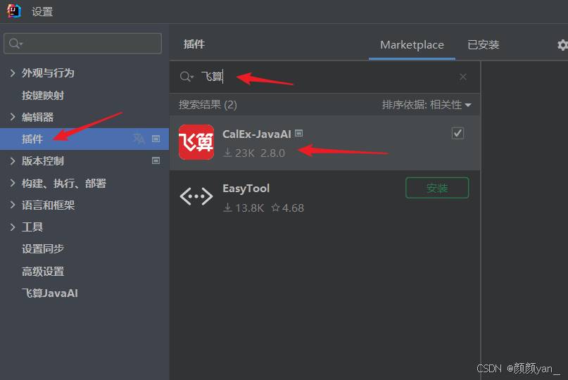 通过文件→设置→插件→Marketplace搜索"CalEx JavaAI"或"飞算"进行安装。