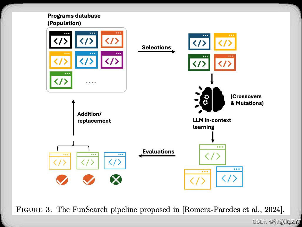 FunSearch 由 Romera-Paredes 等人提出(2024),其核心思想是让 LLM 生成程序,然后让外部系统验证这些程序的有效性与优劣,再选出好的样本继续引导生成。