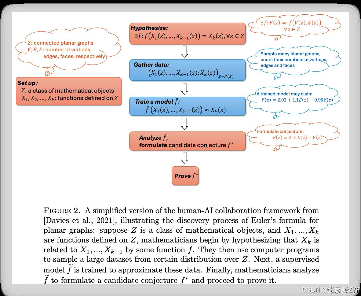 这一协作流程被 [Davies et al., 2021, 2024] 等人系统化后,首次在超曲面结理论(Hyperbolic Knot Theory)与表示论(Representation Theory)中取得突破。他们构建了如下的协同工作流,并在论文中以“欧拉公式”的再发现过程为例作了可视化说明。