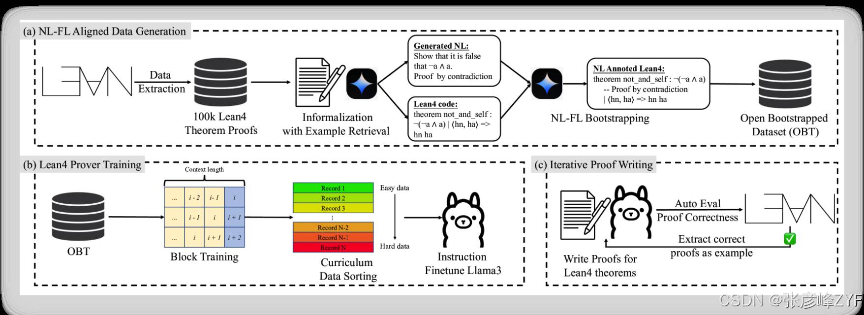 类似的,还有 TheoremLlama 项目,其创新在于将自然语言推理嵌入到 Lean 代码注释中,在形式化证明中保留非形式的解释,从而让 LLM 更容易理解和扩展已有证明。