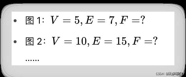 1)假设阶段:设定一个数学对象集合 ZZZ,如“连通的平面图”,在这个集合上定义多个函数变量,如点数 VVV、边数 EEE、面数 FFF。数学家初步假设:这些变量间可能存在某种函数关系。