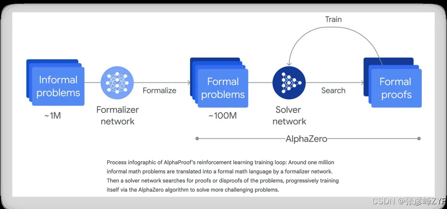 2024 年,谷歌团队发布了引发广泛关注的 AlphaProof 系统,据称它已经在 IMO(国际数学奥林匹克)2024 上达到了“银牌水平”的解题能力。这个系统由两个主要模块组成:
