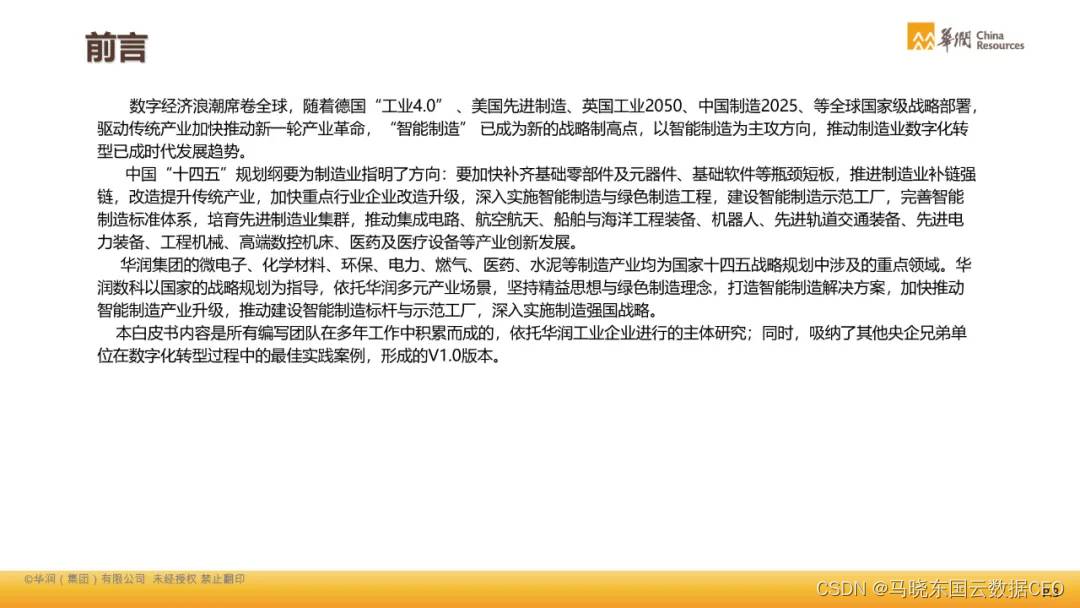 本白皮书内容是所有编写团队在多年工作中积累而成的,依托华润工业企业进行的主体研究;同时,吸纳了其他央企兄弟单位在数字化转型过程中的最佳实践案例,形成的V1.0版本。