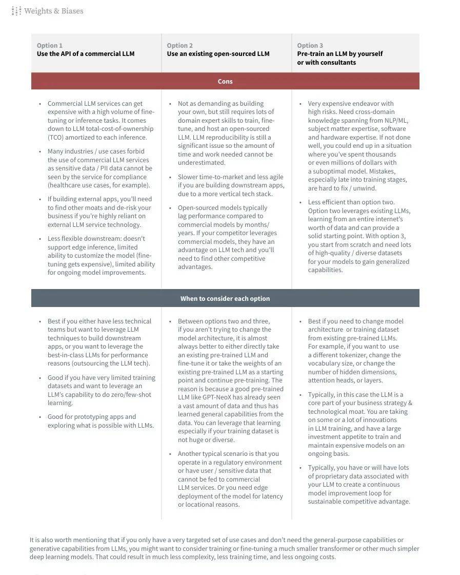 **是否从头开始训练LLM:**指南首先讨论了是否应该自己从头开始训练一个LLM,还是使用现有的商业API或开源LLM。