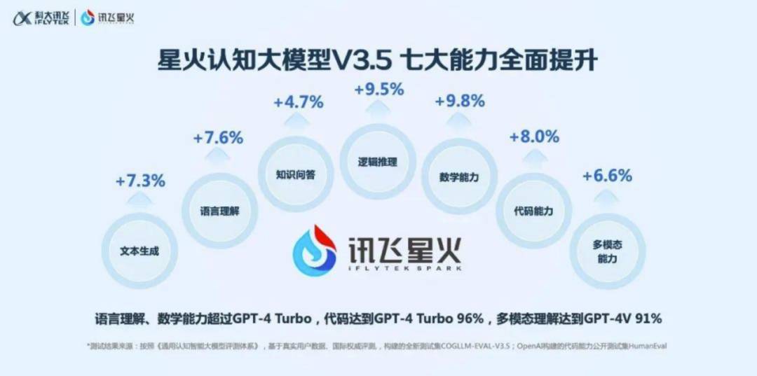 讯飞星火认知大模型具备七大核心能力:文本生成、语言理解、知识问答、逻辑推理、数学能力、代码能力和多模态能力。