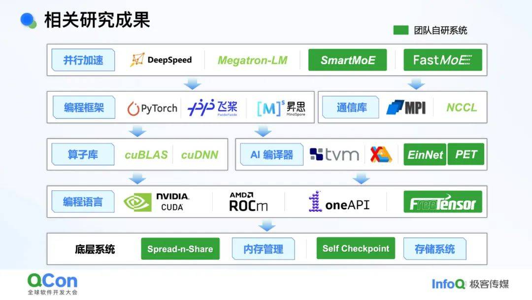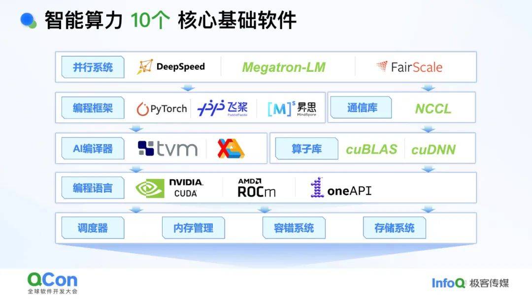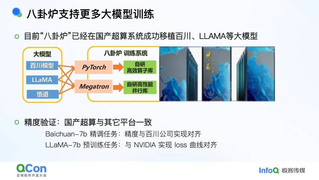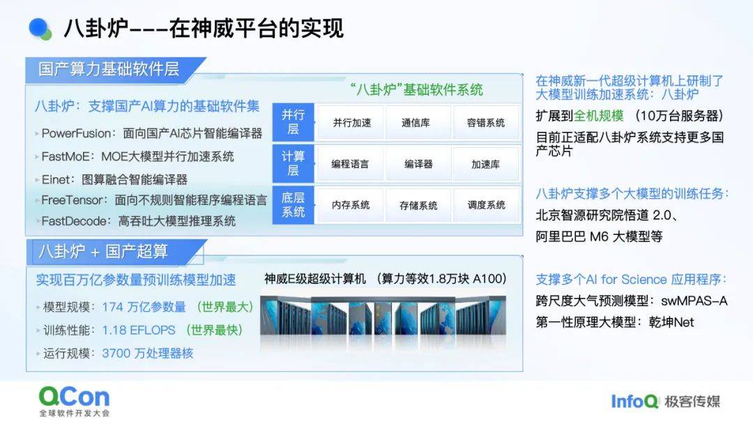 - *解决方案***:**构建“八卦炉”国产智算基础软件生态,覆盖并行加速、编译器、存储系统等10类核心软件。已在神威超算实现174万亿参数模型训练,性能对齐国际水平。