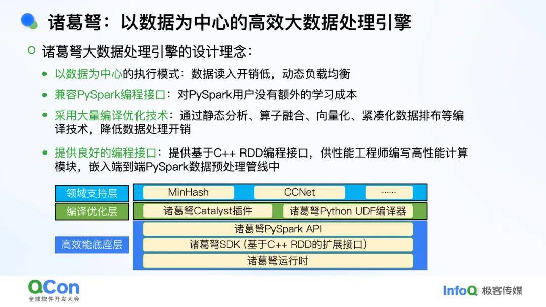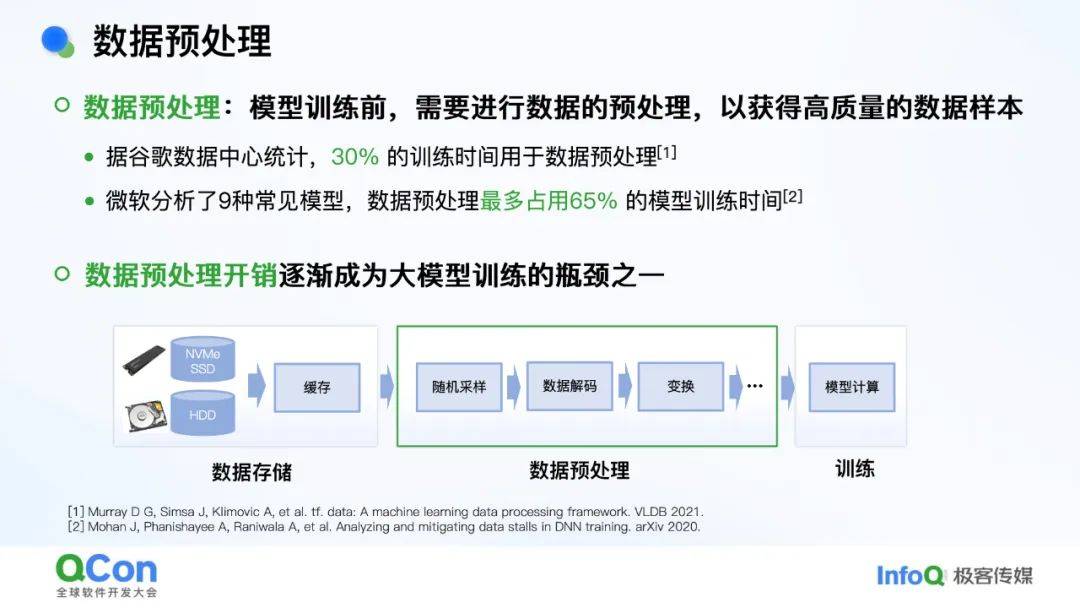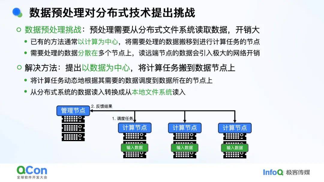 - *数据预处理***:**占训练时间30%~65%,随机读取小样本导致网络开销大。解决方案是“以数据为中心”,将计算任务调度到数据所在节点(如诸葛弩引擎)。