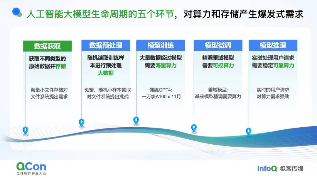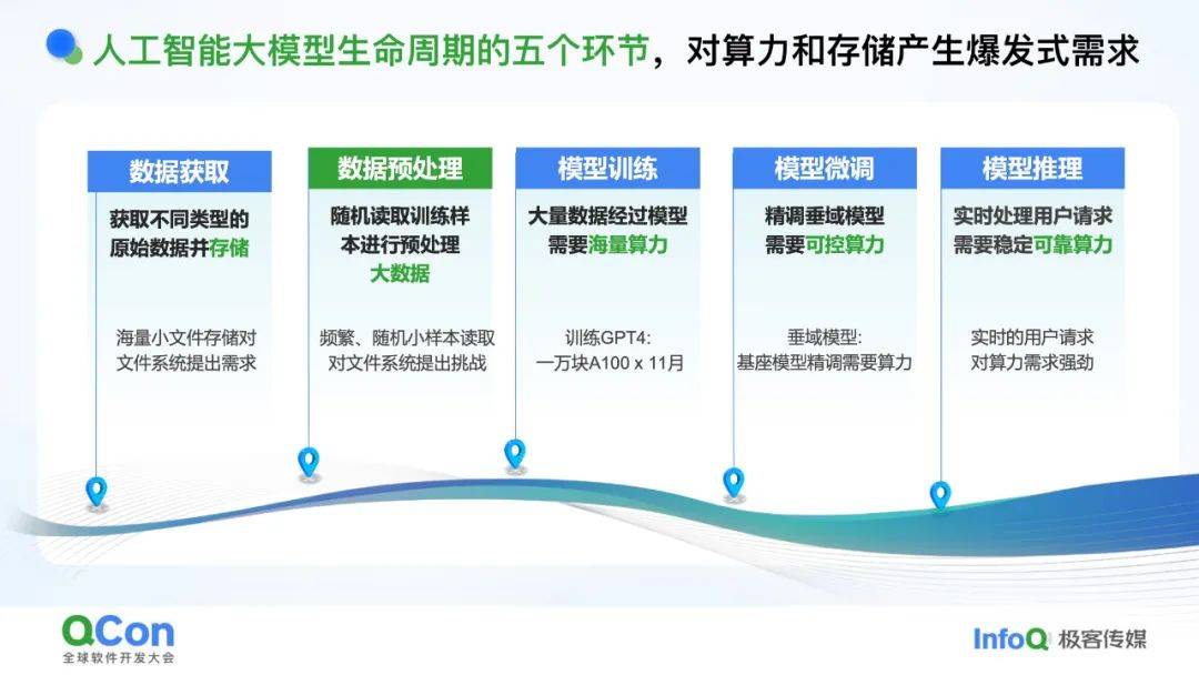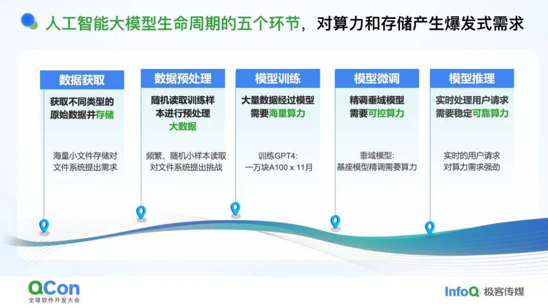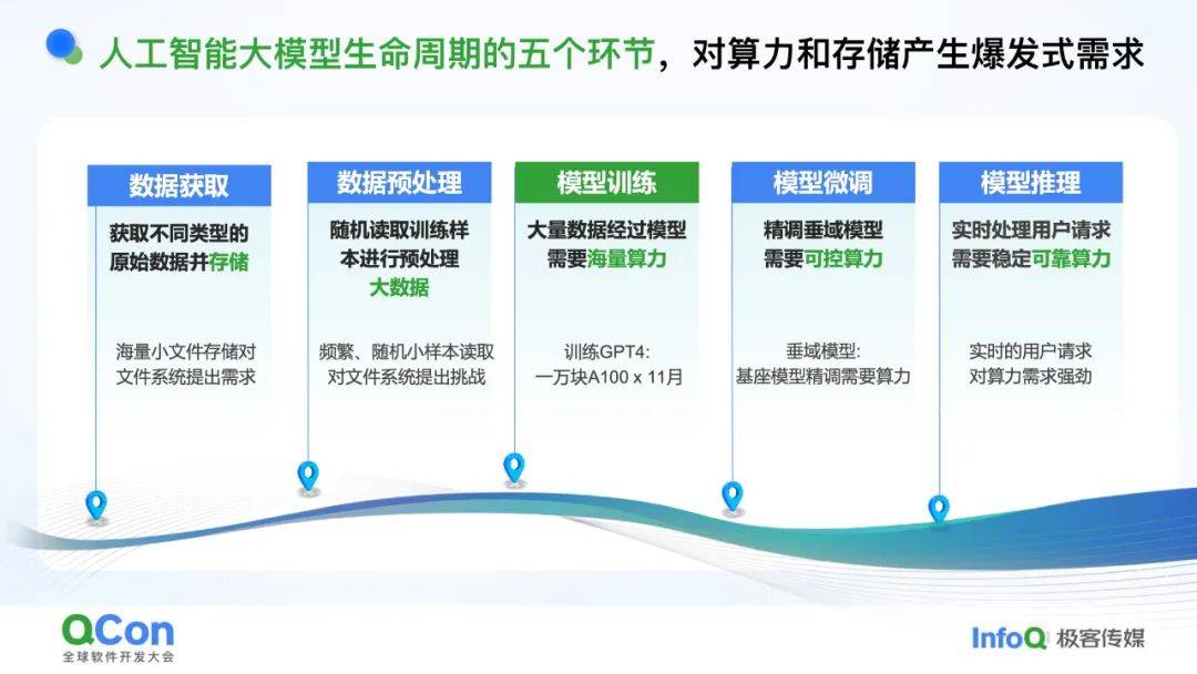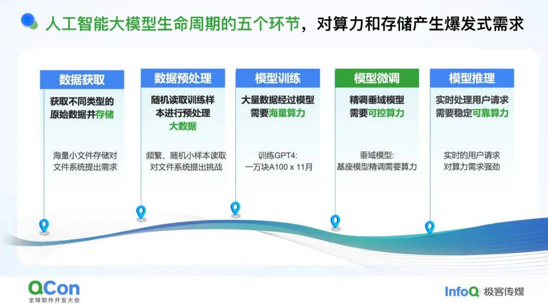 大模型从数据到落地需经历五个环节,每个环节都对算力和存储提出“爆炸式需求”: