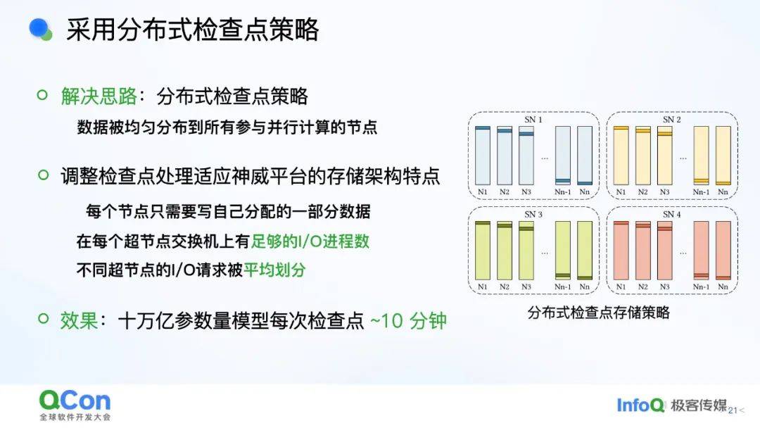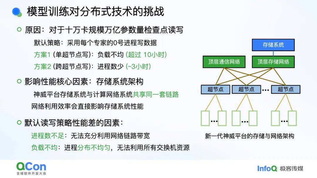- *模型训练***:**硬件错误率高,检查点文件巨大(万亿参数需12TB存储)。优化方法包括分布式检查点策略,将写入时间从3小时缩短至10分钟。