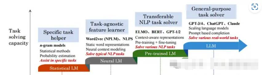 在这场技术热潮中,语言大模型作为领军者,通过大规模预训练学习了丰富的语言知识与世界知识,进而拥有了面向多任务的通用求解能力。其发展脉络清晰可见,历经统计语言模型、神经语言模型、预训练语言模型,直至现在的语言大模型(探索阶段)的四个阶段。