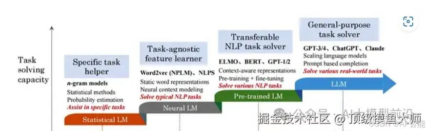 语言大模型作为此次热潮的引领者,通过大规模预训练学习大量语言知识与世界知识,具备面向多任务的通用求解能力。其发展经历了统计语言模型、神经语言模型、预训练语言模型到语言大模型(探索阶段) 的四个阶段。