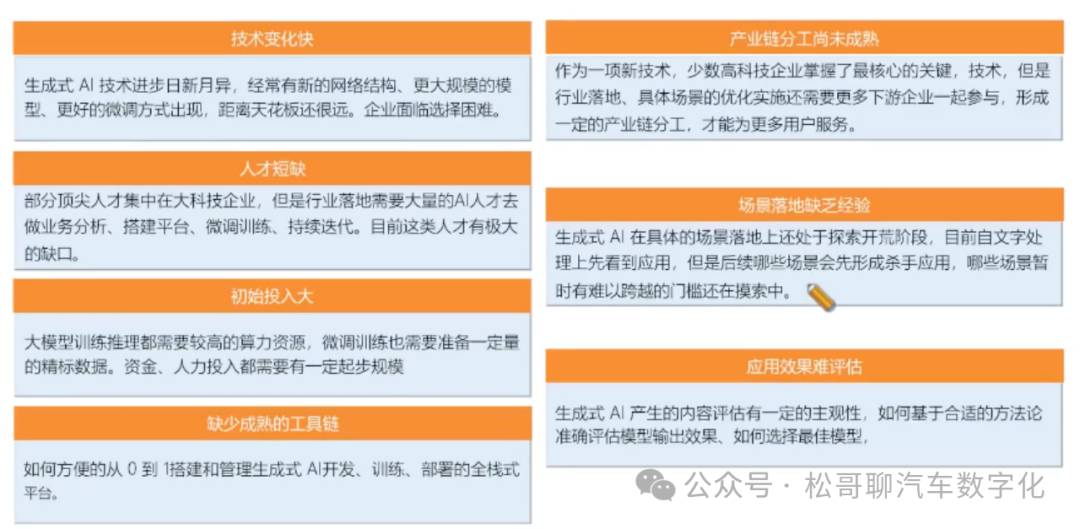 目前建设大模型主要痛点包括:技术变化快,人才短缺,初始投入大,缺少成熟的工具链,产业链分工尚未成熟,场景落地缺乏经验,以及应用效果难评估等。
