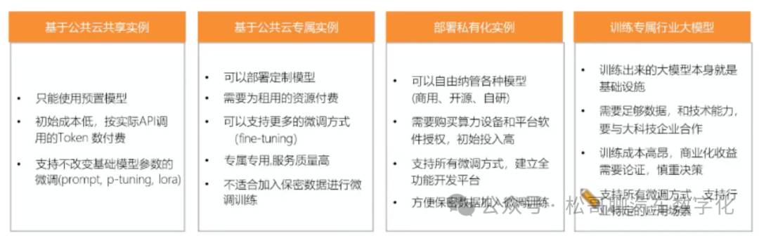 另外就是私有部署,私有化的大模型是最贵的,基于通用的行业大模型,训练公司自己的垂直大模型,或者进一步训练各个业务场景的大模型,如营销的、销售的、售后的大模型等等。