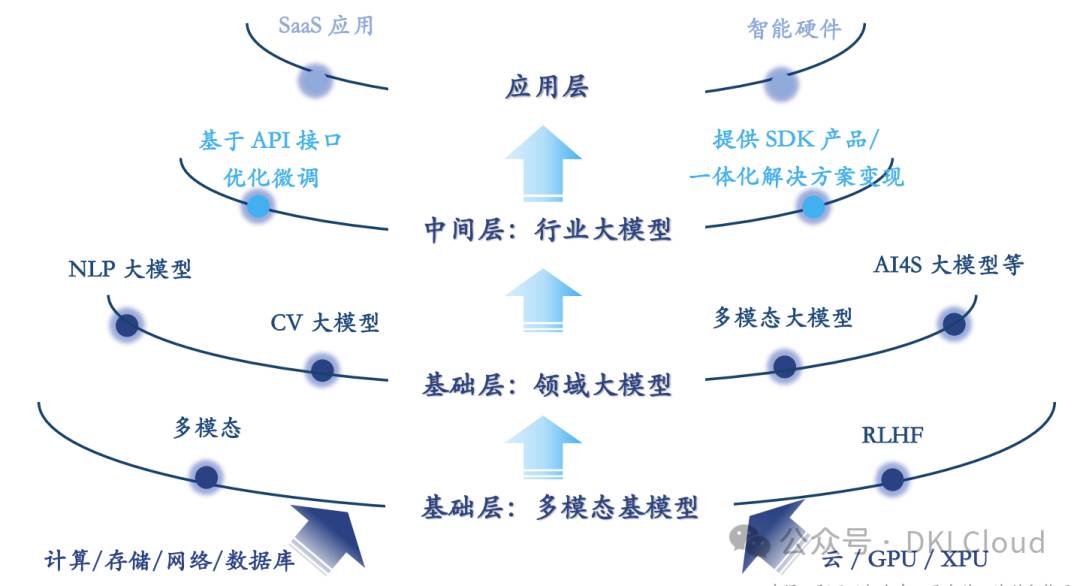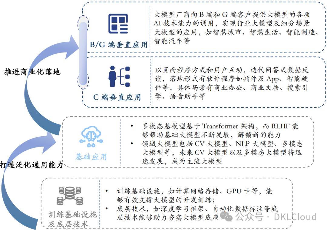 大模型“训练基础设施–底层技术–基础应用–垂直应用”发展路线逐渐清晰。