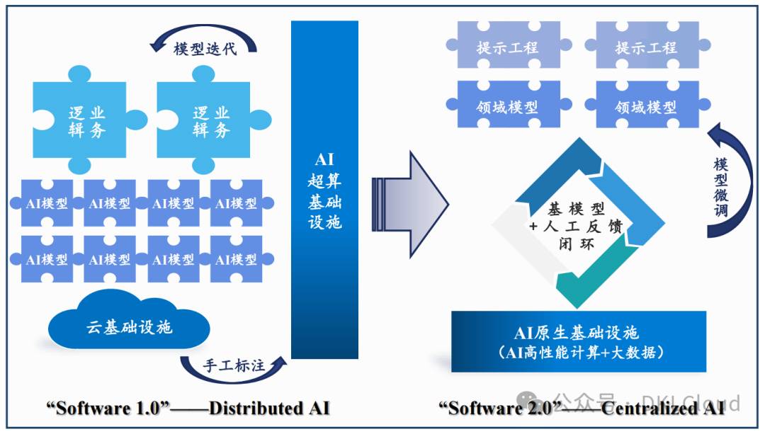 在大模型的加持下,逐渐形成围绕大模型结合人工反馈强化学习为核心的软件开发新范式,通过模型微调的手段,可以基于超大规模基模型,打造出领域大模型或者行业大模型,进而覆盖更多行业自场景。