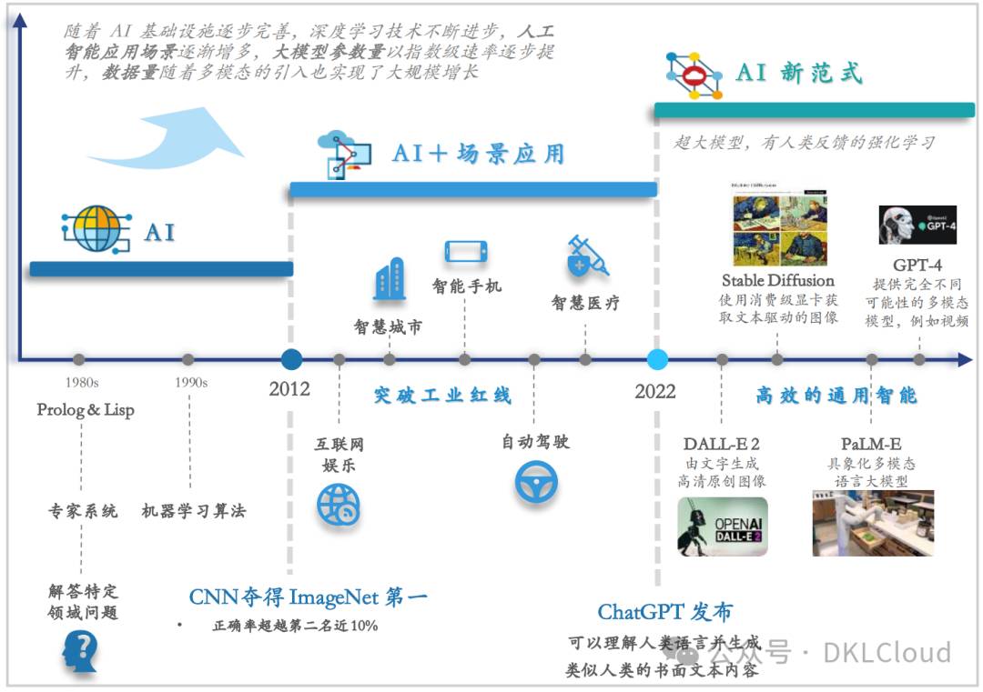 人工智能近年来高速发展,现已经进入了以 AGI 为代表的新里程碑阶段。随着AI 基础设施逐步完善,深度学习技术不断进步,人工智能应用场景逐渐增多,过去模型参数规模和数据量也实现了大幅度增长,为 NLP、CV 等领域带来更强大的表达能力和性能。人工智能发展历程中主要有两大里程碑: