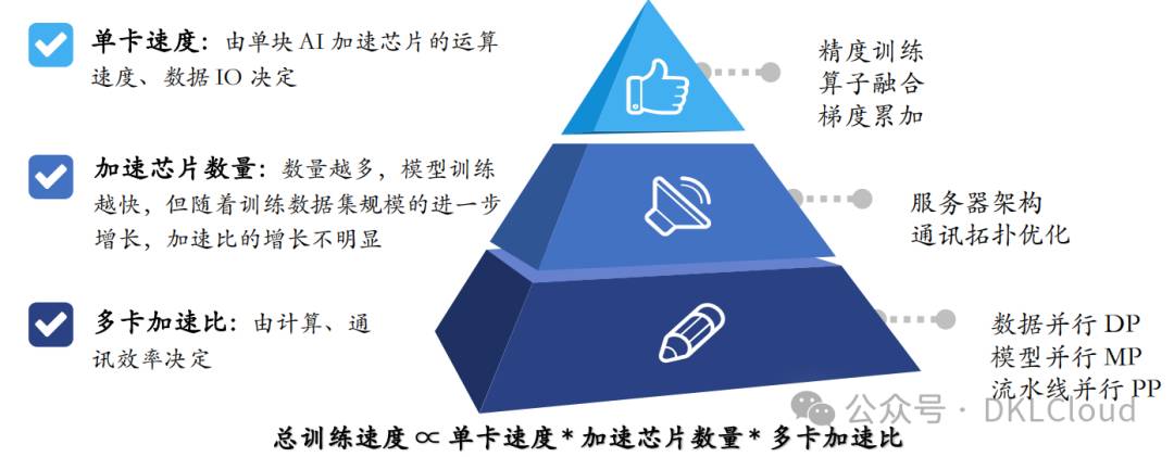 厂商在大规模分布式训练的运行和调度的工程经验,能够帮助提升模型训练的速度和精度。AI 计算能力不仅仅依赖于算力堆叠,随着数据量的不断增加,超大模型训练需要提升训练速度,减少训练时间,因此需要将数据和计算负载切分到不同设备上,降低设备间通信所需的代价,在多张卡上实现超大规模并行计算。在模型并行、流水并行、数据并行等分布式训练的基础上,还需要考虑计算、存储、网络以及上层的框架等各个环节全面协调配合,考验的是厂商全栈全流程的综合能力。