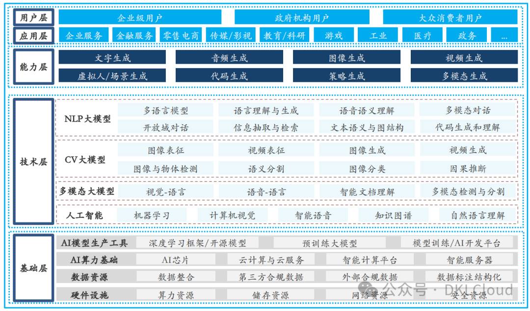 能力层、应用层及用户层: 在基础层和技术层的支持下,AI 大模型拥有了文字、音频、图像、视频、代码、策略、多模态生成能力等,具体应用于金融、电商、传媒、教育、游戏、医疗、工业、政务等多个领域,为企业级用户、政府机构用户、大众消费者用户提供产品和服务。