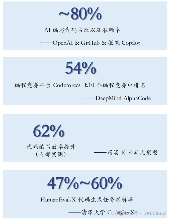 DeepMind 的 AlphaCode 在 Codeforces 上托管的 10 个竞赛中总体排名前 54%,清华大学开发的多编程语言代码生成预训练模型在 HumanEval-X 代码生成任务上取得 47%~60% 求解率。基于大模型的高精度代码生成,能够提高软件开发的效率,标志着人工智能向 AGI 更进一步。
