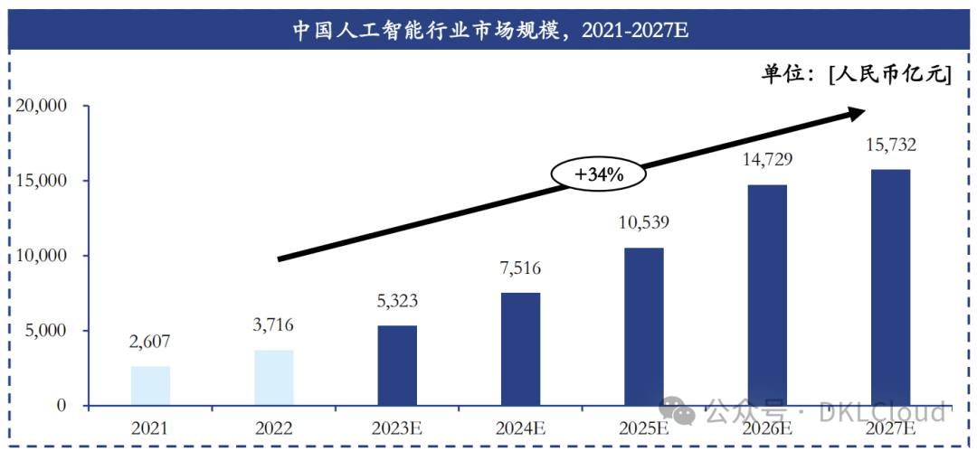 人工智能能够赋能经济社会发展各领域,下游各个领域的产业升级对大模型的需求持续走高。例如,在泛交通领域,人工智能能够在自动驾驶、智能座舱、运行管理优化等多个方面为汽车行业创造价值;在医疗方面,人工智能可以提高疾病检测的效率以及医学影像领域的智能化分析。据测算,2022 年中国人工智能行业市场规模为 3,716 亿人民币,预计2027 年将达到 15,372 亿人民币,有望在下游制造、交通、金融、医疗等多领域不断渗透,实现大规模落地应用。