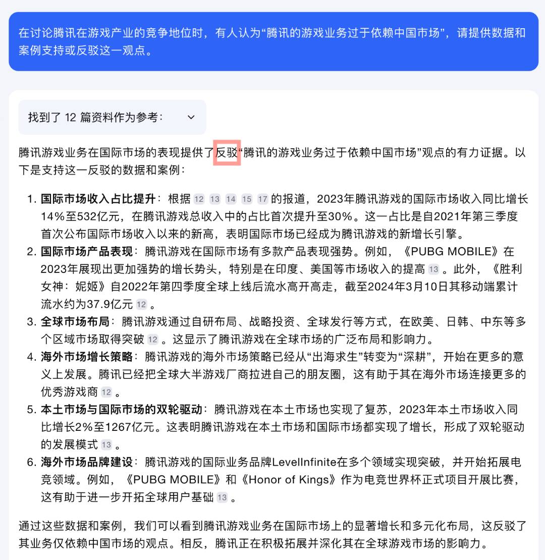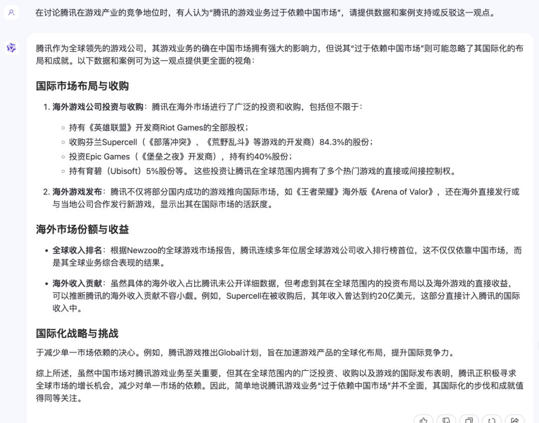 通义千问持“反驳”观点。回答的亮点:提到了“国际市场布局与收购”,并给出了相应的持股数据。足之处,海外游戏收入的数据未能抓取,对于腾讯财报的数据引用几乎为0。