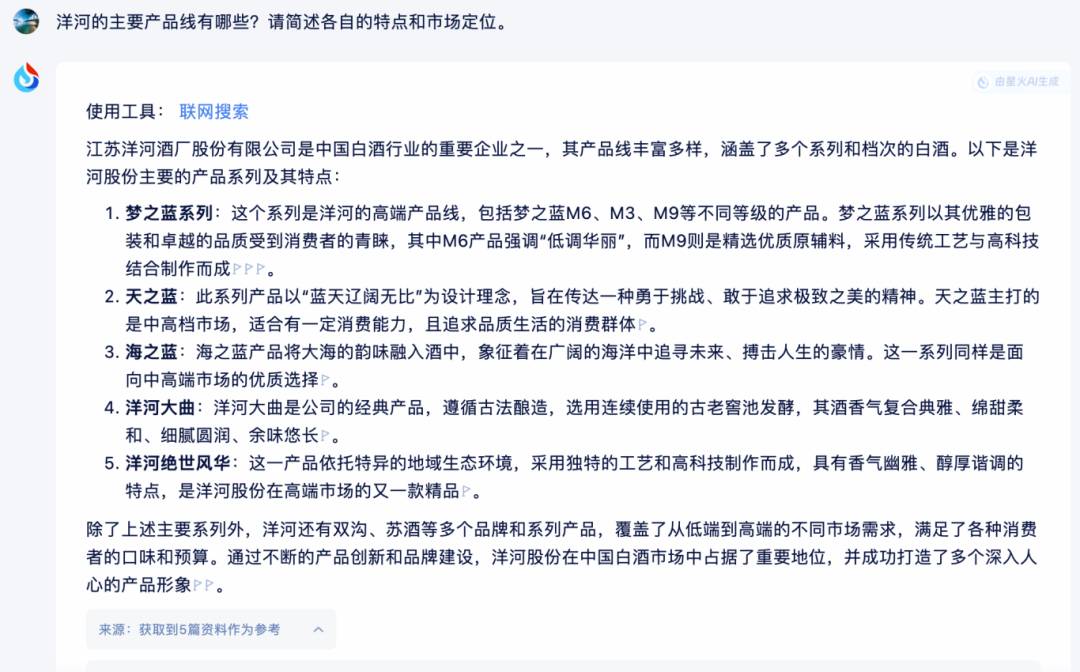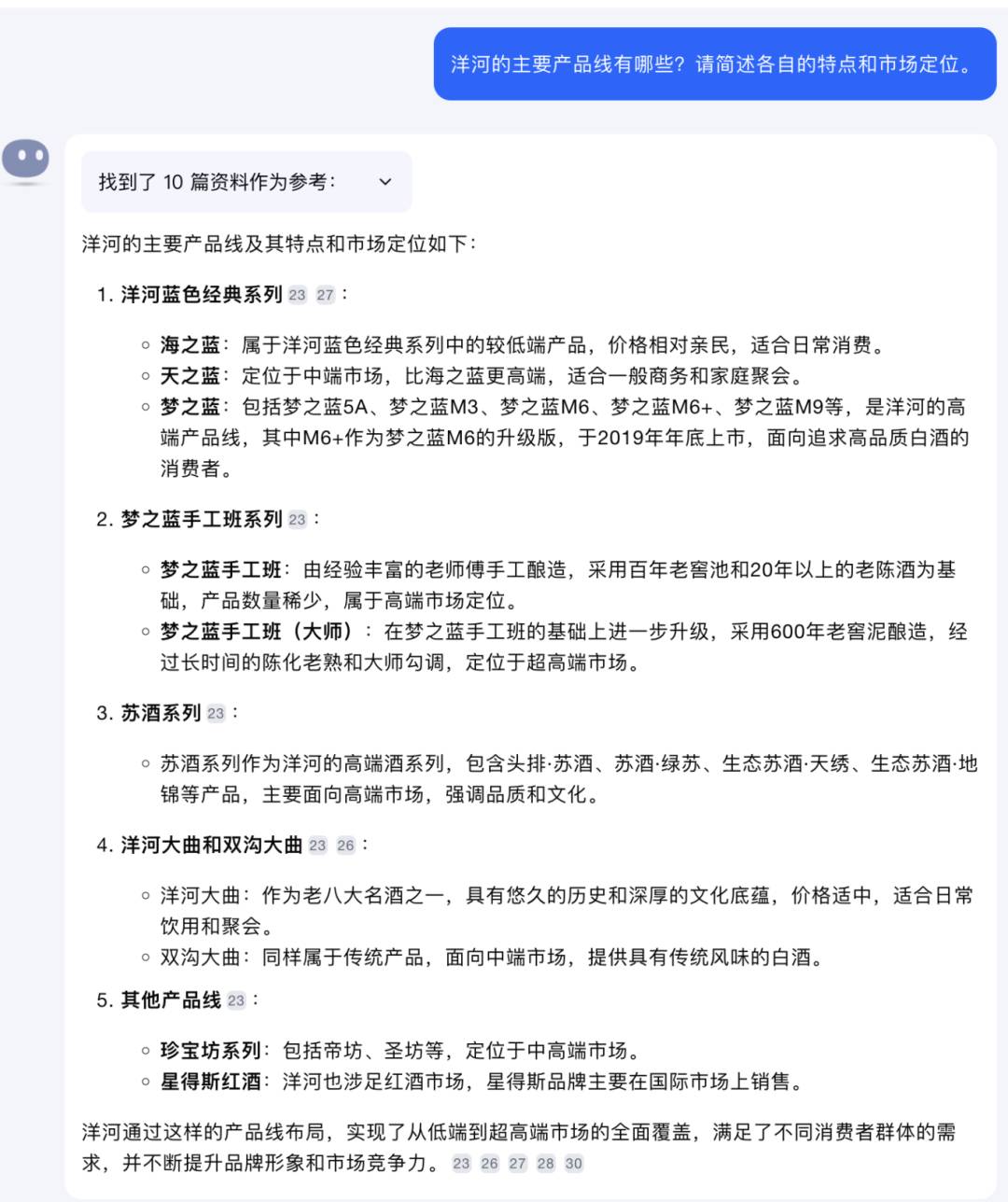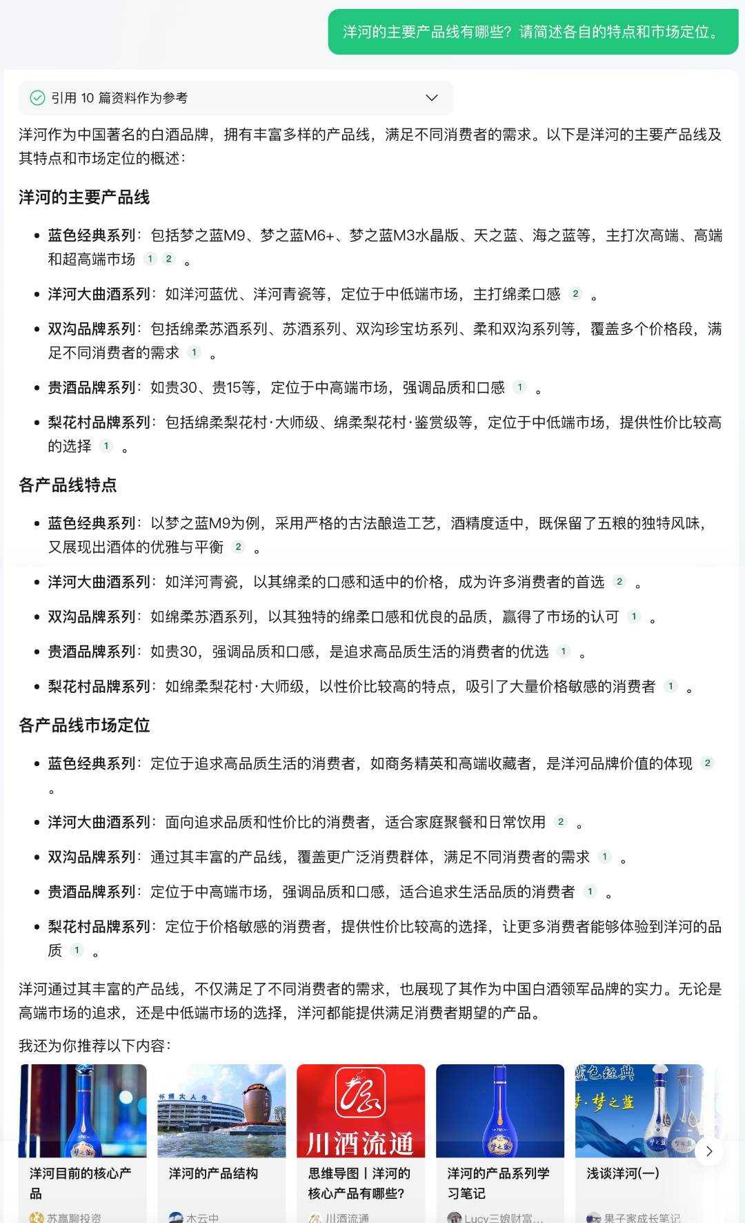首先从问题回答上看,都有提及产品线、特点、定位。但给出的产品线不够全面,仅提及了蓝色经典、洋河大曲、洋河特曲。