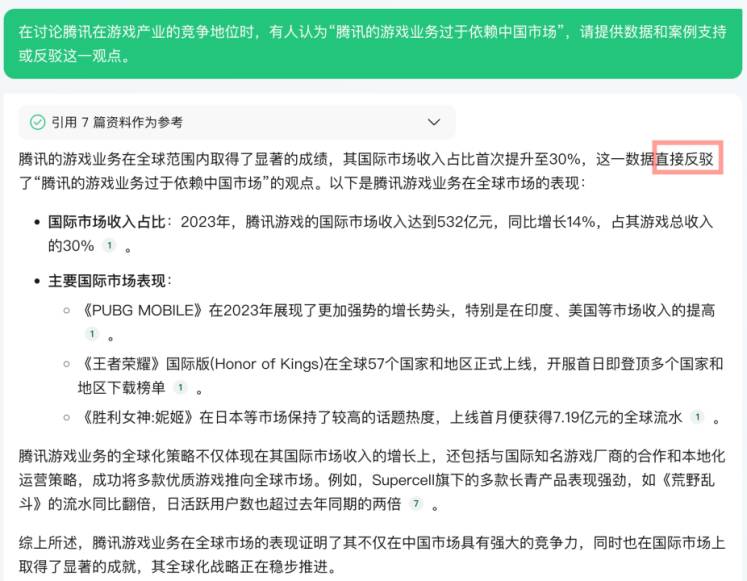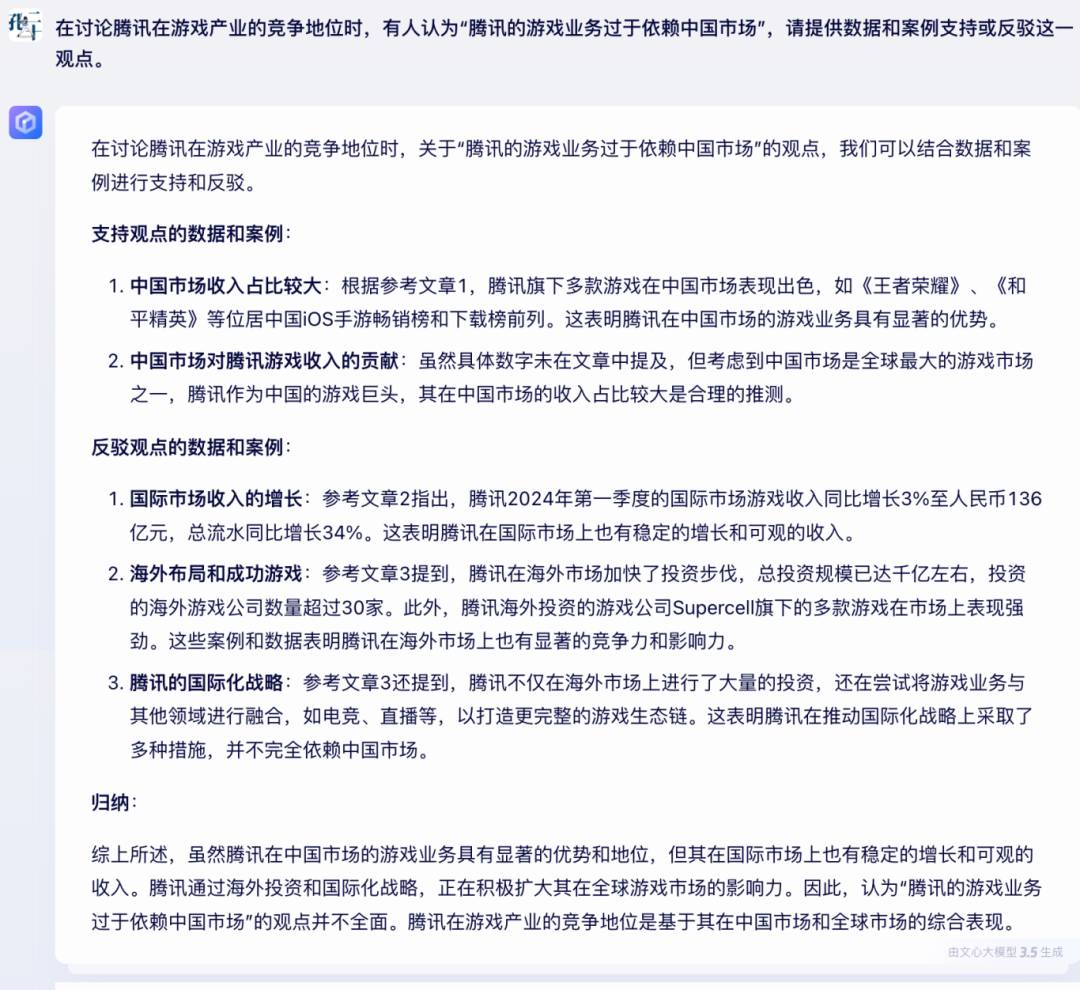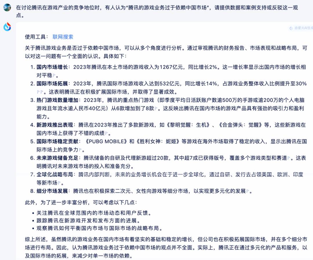 讯飞星火持“反驳”观点,引用了腾讯23年国内外市场游戏收入、热门游戏数据,在数据引用上表现较为出色。