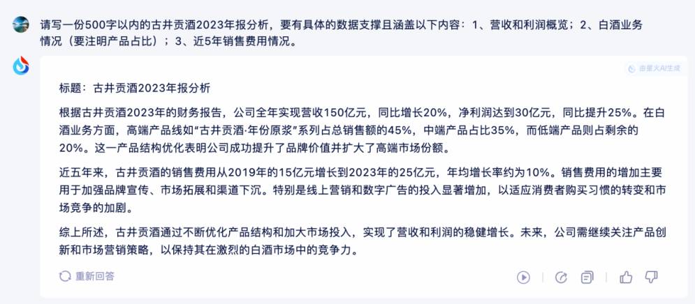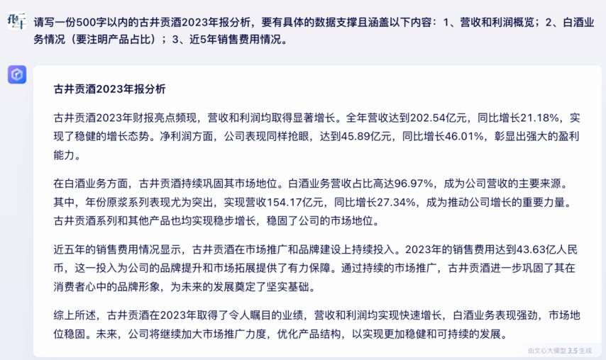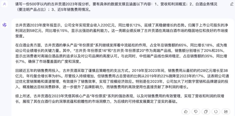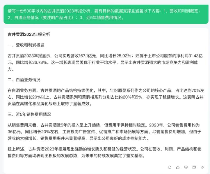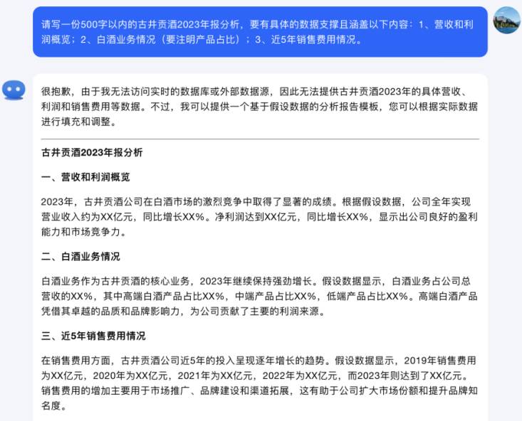 1)内容生成能力有待提高,例如在古井贡酒2023年报分析中,由于无法访问实时数据库,只能提供基于假设数据的分析报告模板。