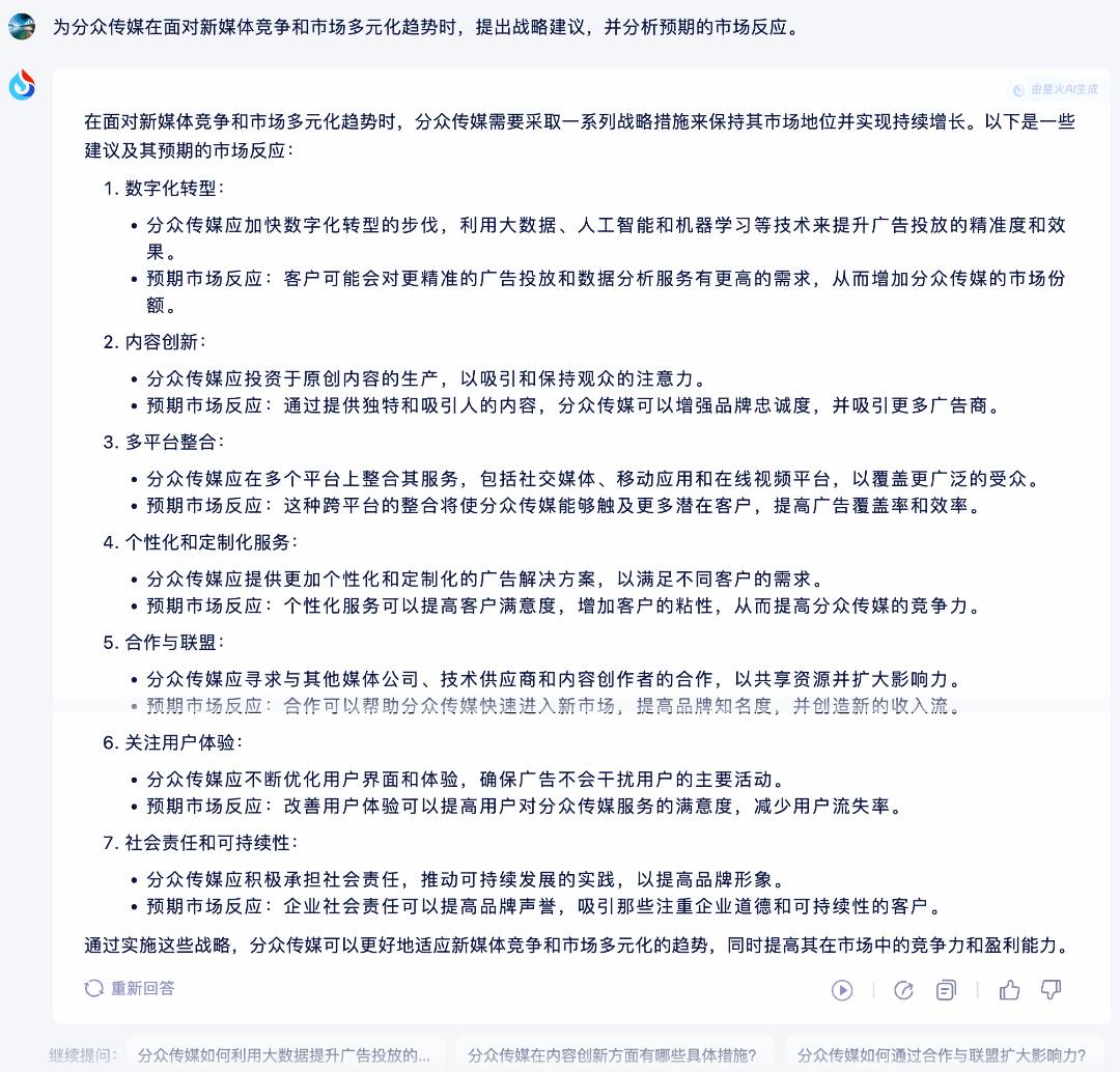 讯飞星火相比于通义千问的回答,要多出3条“个性化和定制化服务、关注用户体验、合作与联盟”,其余4点建议均有所共同点。