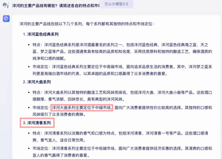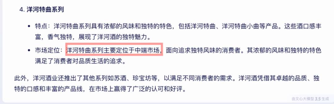 错误点也挺多,下图可见AI把洋河大曲、洋河特曲描述为“定位于中端市场”;还出现了“洋河清香系列”,洋河不是浓香型吗?百度也没看到有“洋河清香系列”。