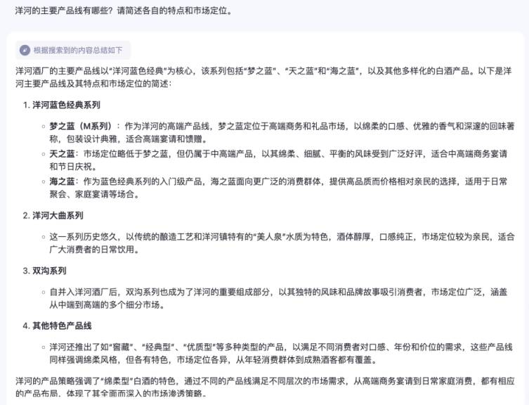 根据问题有针对性地从“主要产品线”、“各产品线特点”、“各产品线市场定位”3个角度进行阐述。描述准确度也不错,阐述也更全面,提到了梨花村、贵酒、双沟系列的产品,但少了红酒系列。