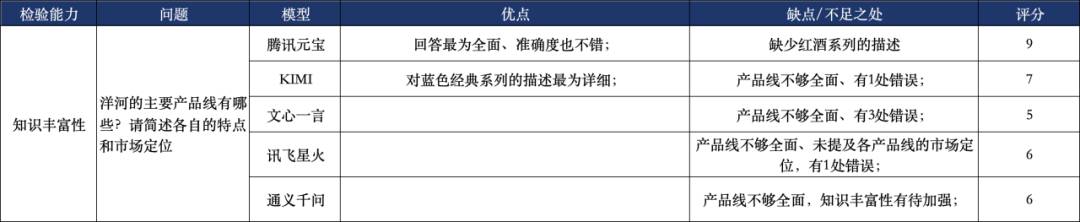 1)知识丰富性有待提高,例如在洋河的主要产品线描述中,遗漏了一些重要产品线。