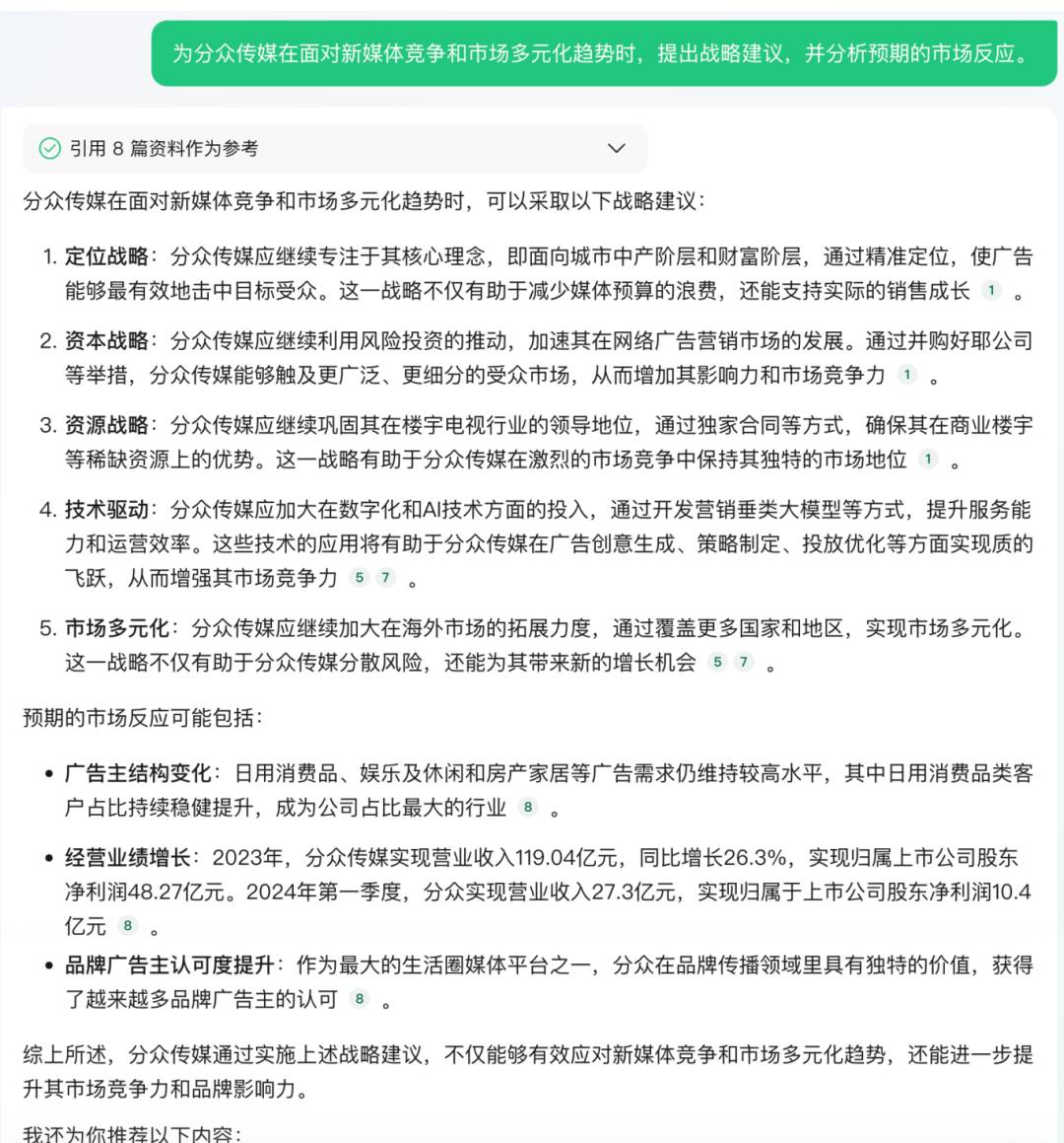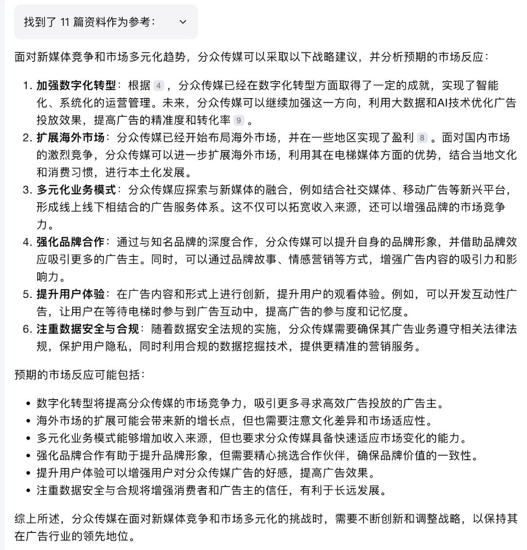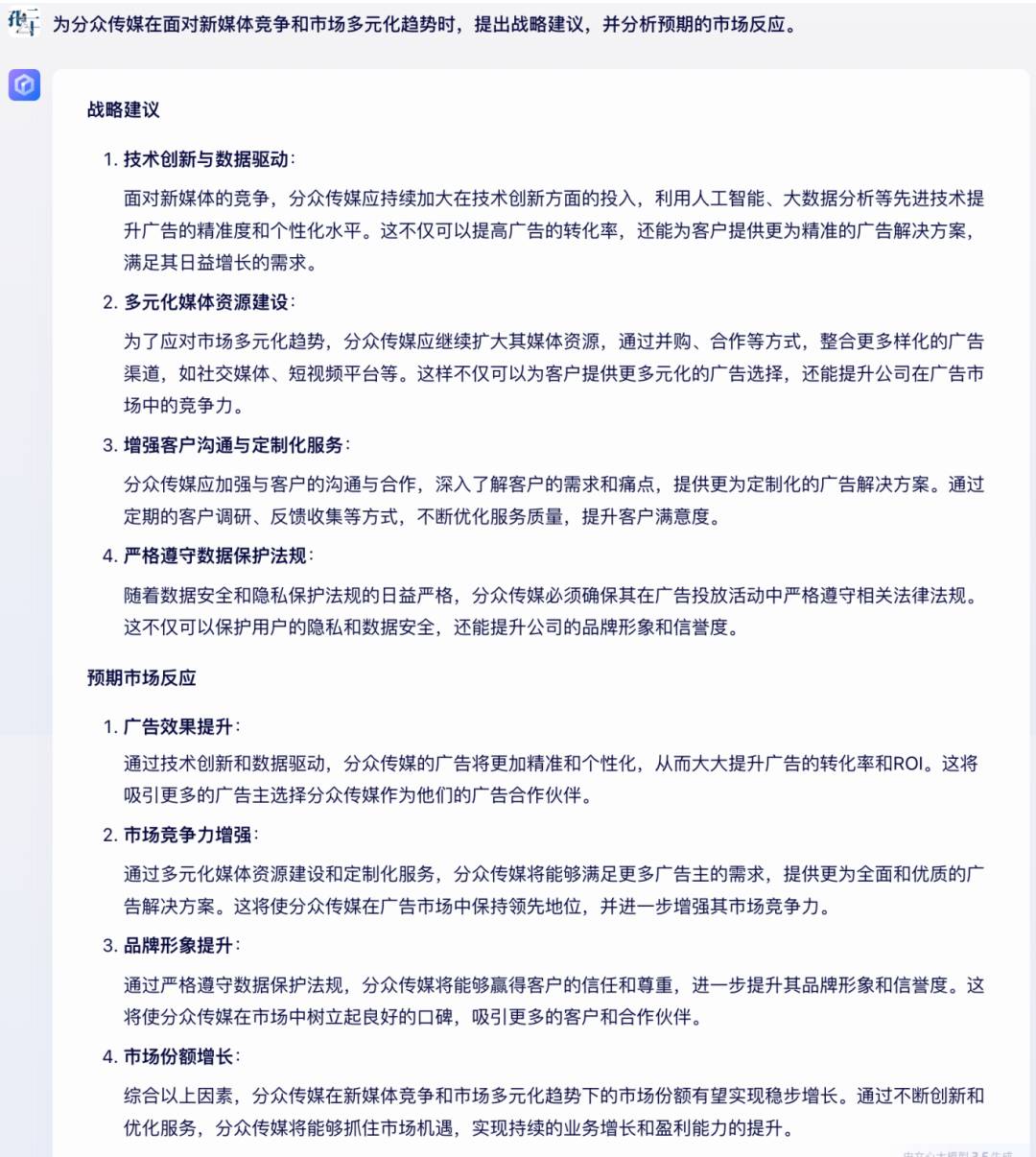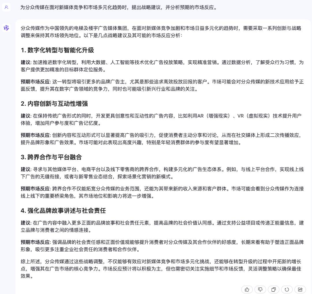 腾讯元宝:除了大家都提到的数字化、AI技术投入,还提到加大海外市场的拓展力度。其他的建议及预期市场反应回答得中规中矩,个人感觉这题回答得没有通义千问、讯飞星火、Kimi全面、准确。