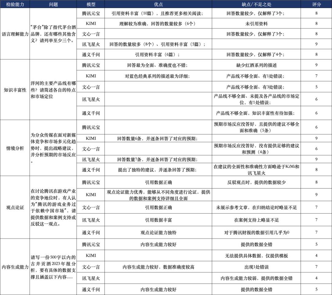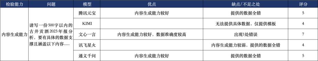 提升空间:1)内容生成能力有待提高,例如在古井贡酒2023年报分析中,引用的数据错误较多。2)在情境分析方面,给出的建议及预期市场反应相对较弱。