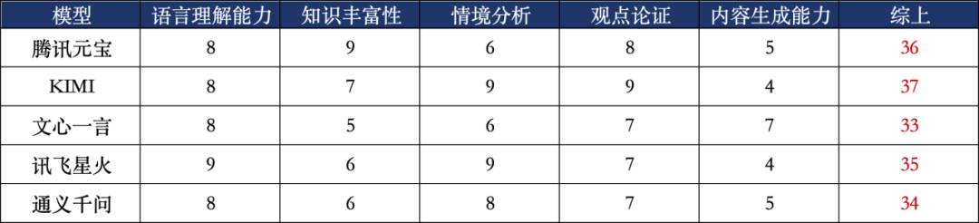 各大模型在各个方面都有一定的优势和不足,根据前面的5大能力评测,得出总分如下:Kimi分数37;腾讯元宝36;讯飞星火35;通义千问34;文心一言33。